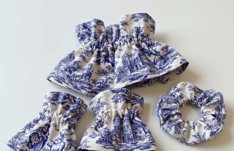 Conjunto Toile de Jouy: Gola, Punhos e Scrunchie – Tendência 2026